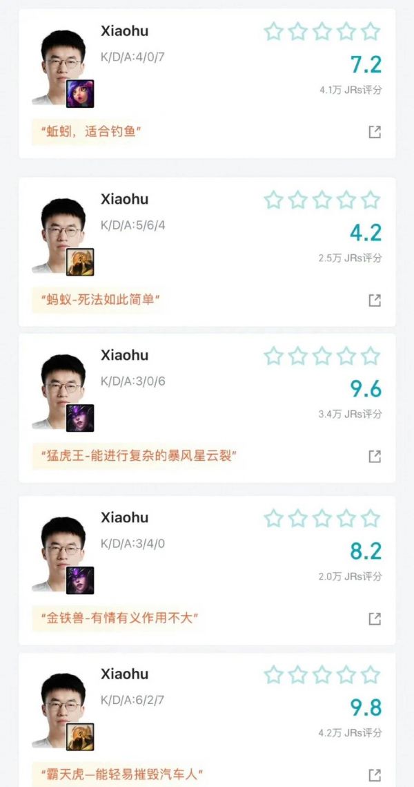 如果说全国高校评分中玩梗与正经同在,那另一大出圈的《英雄联盟》世界赛选手评分中,玩梗便占据了压倒性的优势。比如八强赛WBG对阵BLG战队的比赛结束后,虎扑最出圈的就是那张WBG中单选手李元浩“从蚯蚓到霸天虎”的进化论式评分梗图,这也是虎扑评分体系事实上也是一场造梗运动的具象体现。