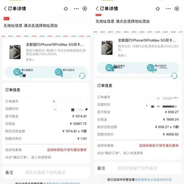 在该平台上,记者选择了一款256G的iPhone 15 Pro Max,平台显示租期为365天,若选择租完归还,每月支付658.27元,总租金为7899.24元,若到期选择买断还需支付4999.5元。意味着获得总共要支付12898.74元;即使选择租满即送,每月需支付租金1074.81元,租满12期,总租金为12897.72元。