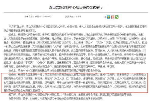 泰安市政府官网显示,仪式前会见、交流时王思聪表示,北京寰聚商业管理有限公司将以“新场景、新玩法、新潮流”为切入点,以“复合业态、多重场景、深度体验”为手段,全力以赴把泰山文旅健身中心项目建设成集娱乐健身、四季滑雪、运动酷玩、青年社交和亲子科普于一体的年轻力、微度假目的地,实现以商承文、以文促旅、以旅兴商,推动文商旅融合发展。