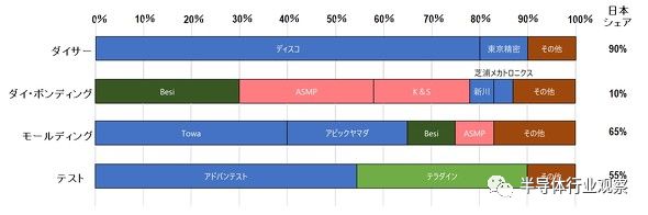 在具体的后端设备市场中,日本垄断了划片机市场90%的份额,虽然贴片机市场份额仅为10%,但成型市场占有率达到65%,测试市场占有率达到55%,两者均超过一半。