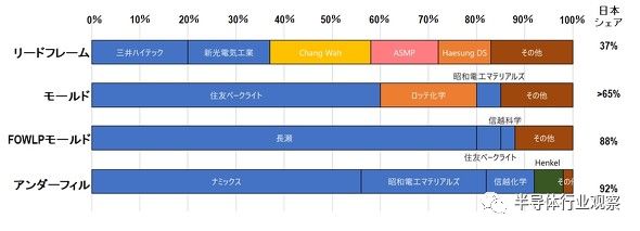 后处理材料的市场中。日本的引线框架份额仍保持在 37%,在用作密封材料的模具方面的市场份额超过65%。此外,日本垄断了FOWLP(扇出晶圆级封装)88%的成型材料,例如台积电为苹果iPhone开发的InFO(集成扇出WLP),而日本在底部填充材料的份额也达到了92%,接近于垄断的地步。