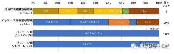 虽然日本用于低端通用印刷电路板(PCB)的覆铜箔板的份额可以忽略不计,并且由中国大陆和中国台湾制造商主导,但日本在高端封装用覆铜箔板的占有率超过65%,在封装用增层基板、封装用阻焊剂方面更是达到了100%垄断的地步。