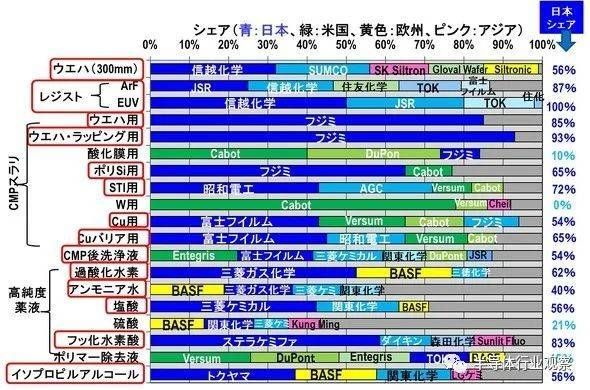 更重要的是,各公司用于预处理的主要材料的份额中日本也可谓遥遥领先,日本市场占有率很高的材料包括硅晶圆、各种抗蚀剂、各种CMP浆料、各种高纯度化学品等,甚至可以说,日本材料厂商的存在感比设备厂商更强。