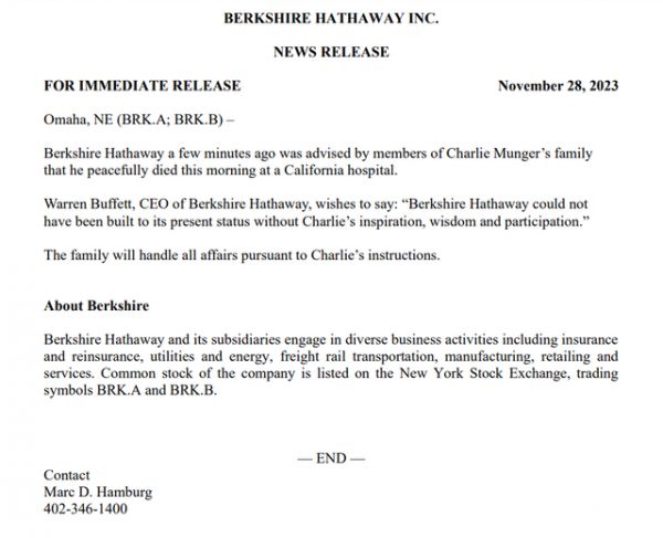 几分钟前,查理·芒格家族成员们告知伯克希尔·哈撒韦公司,芒格今天早上在加州的一家医院安详地去世。