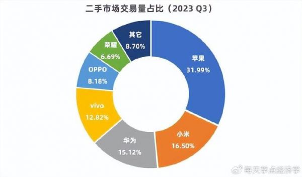 从国内数据来看,2023年Q3,苹果的二手机占据了整个交易量的近三成,和小米、华为一起,占据了整个二手机市场超六成的比重。