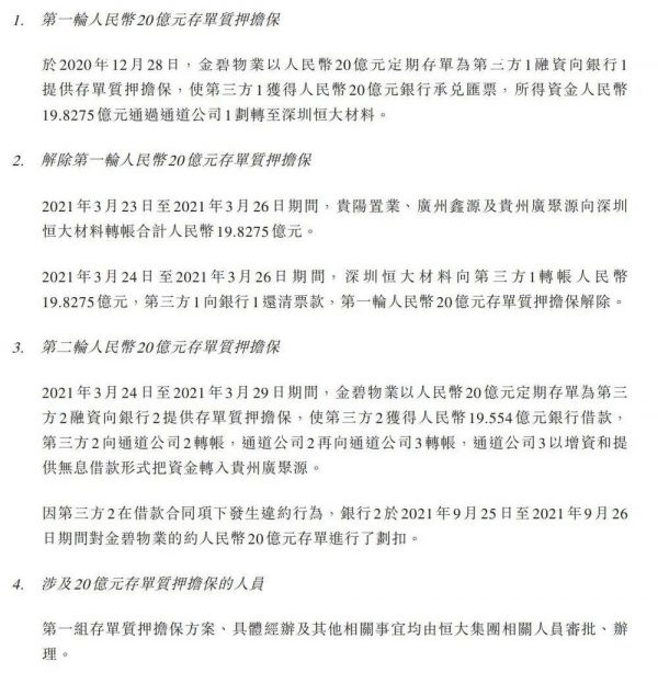 以第二组存单质押担保27亿元为例,2021年6月,金碧恒盈及恒大恒康(恒大物业的两家附属公司)通过在银行的定期存款,向6家第三方公司提供合计金额为27亿元的存单质押担保,使该等第三方公司取得27亿元的银行票据。在2021年6月的同一时期,上述6家第三方公司中的一家,向恒大提供27亿元,该资金随后被用于向金碧物业作出同等金额的付款。金碧恒盈及恒大恒康提供的27亿元存单质押担保于2021年9月被银行强制执行。