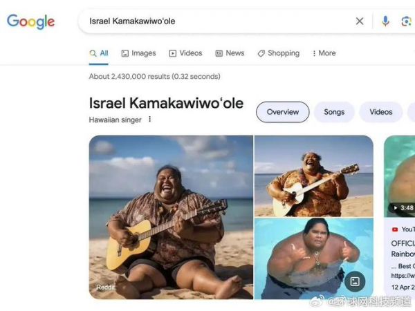【真假难辨:#谷歌搜索结果出现AI生成图片#】近日,一些网友发现,当在谷歌搜索引擎上输入已故夏威夷歌手 Israel Kamakawiwoʻole 的名字时,搜索结果的前几张图片都是由人工智能生成的,而非真实的照片。这些图片由 Midjourney 生成,该工具可以根据自然语言描述来生成图像。