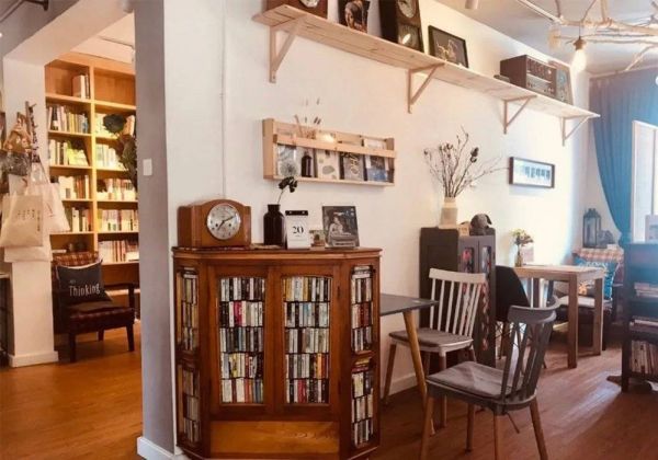 推开门的瞬间会让你有一种穿越感——一个堆满了书籍的客厅,暖黄色的木质装修,80平方米左右的空间隔出了几个座位和饮品区,能摆放书的地方几乎都被书填满了。窗外是一个露台,坐在那里可以看到对面的黄色筒子楼。