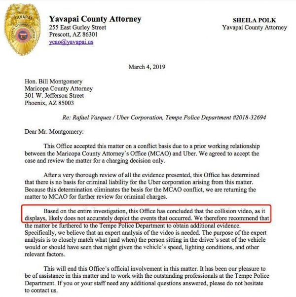 因此,检察官判定优步无罪的同时,建议当地警方请专家分析车辆的速度、照明条件和其他相关因素,并对安全驾驶员额外调查。