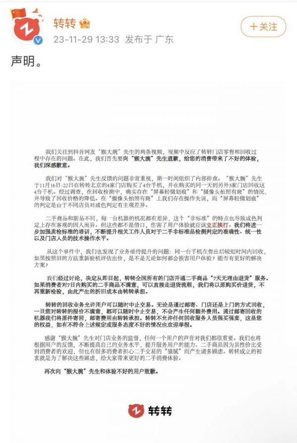 对此,在11月29日发布的回应中,转转称,我们对“猴大腕”反馈的问题非常重视,第一时间组织了内部排查。