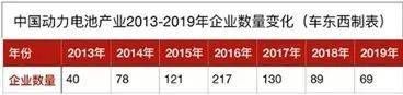 2019年,新能源补贴退坡幅度超过50%,其产品销量同比 “五连跌”,造成上游动力电池企业淘汰出清。同时,白名单废除,外资巨头动力电池企业再次进入国内,抢占二三线动力电池企业市场。这一年,动力电池企业数量只剩下69家。