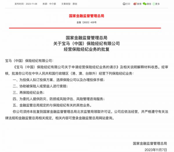 宝马(中国)则成立了一家宝马(中国)保险经纪有限公司,并在2023年11月8日获得国家金融监督管理总局批准的保险经纪业务许可,这是时隔五年之后,中国保险行业监管机构首次批准新的保险经纪业务许可。