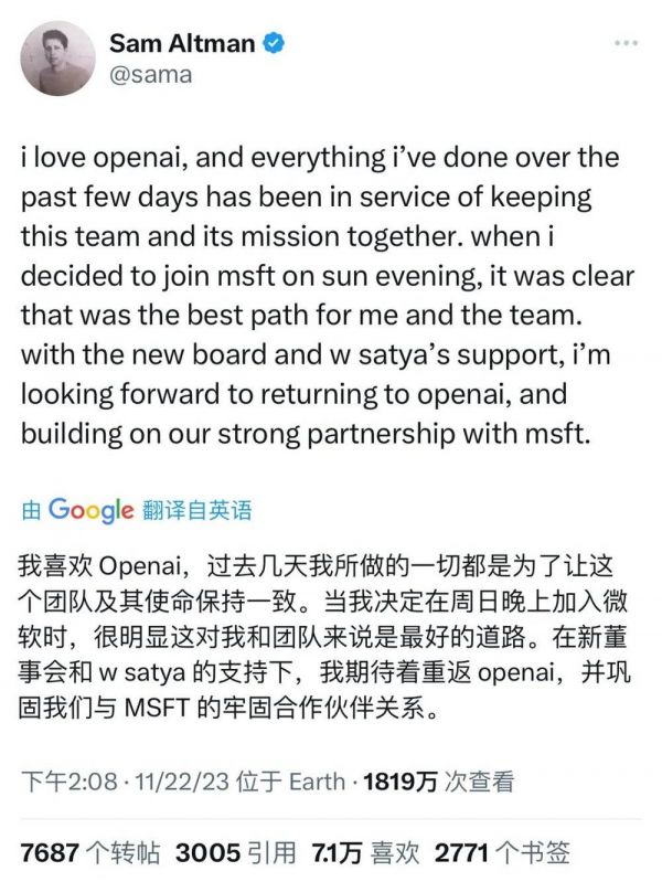 Sam Altman 发推:“我很喜欢在 OpenAI 的时光。这对我个人来说是变革性的,希望对世界也有一点变革。最重要的是,我喜欢与这些才华横溢的人一起工作。稍后会说明更多情况。”