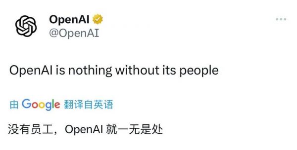 OpenAI 官方账号转发 Brockman 回到公司,与团队合影的照片。并重复发布刷屏推文:OpenAI is nothing without its people。没有员工,OpenAI 什么都不是。之前,转发 Sam 和 Brockman 即将返回岗位的推文,并且比心。