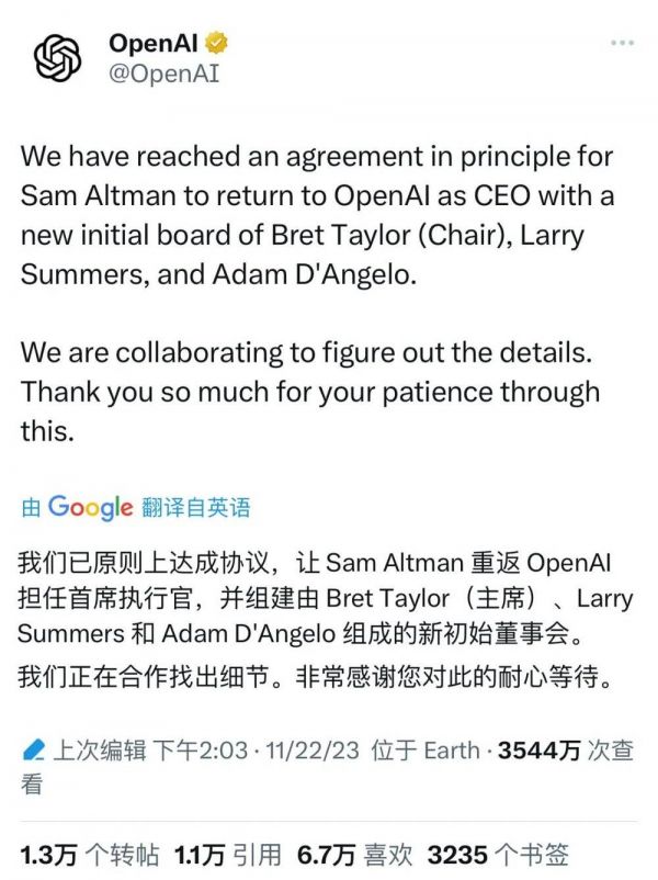 OpenAI 宣布,Altman 将重返公司担任 CEO。新的董事会名单显示,只保留了 Quora 的首席执行官 Adam D'Angelo,Salesforce 前联合首席执行官布 Bret Taylor 和前美国财政部长 Larry Summers 加入新成立的董事会。