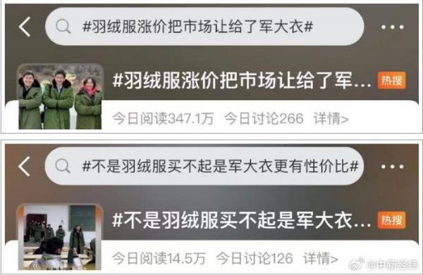 #有店铺军大衣猛卖10万件#【军大衣突然“翻红”!价格几十元,猛卖10万件![哆啦A梦吃惊]】就在网友们为“你能接受千元以上的国产羽绒服吗?”这一话题讨论不休时,今年冬天,一批“整顿羽绒服市场”的大学生重新穿上了军大衣。