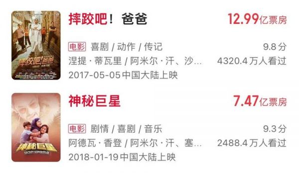 在海外进口片中,除了好莱坞大片,印度电影最受观众喜爱。《摔跤吧!爸爸》卖出12.99亿票房,豆瓣9.0,位列2017年年度票房第七,《神秘巨星》卖出7.47亿票房,豆瓣评分7.7。