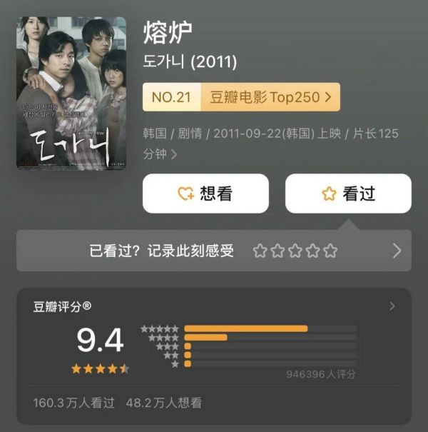 与此同时,韩国电影市场早已刮起了现实主义的风潮,在国内成为高口碑代名词。豆瓣上高分韩片随处可见,豆瓣TOP250里,排名第一的韩影《熔炉》,有94万人打出9.4的高分。