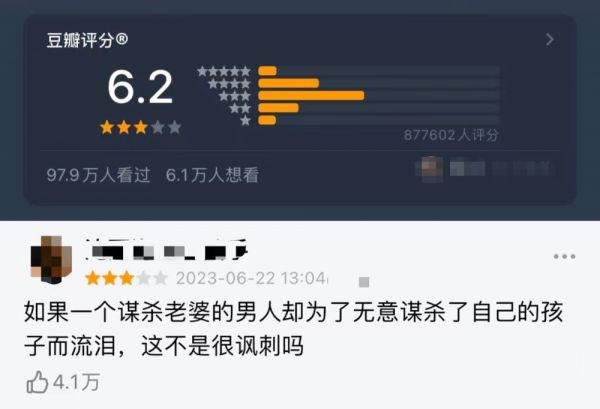 在豆瓣评论区,有不少观众对此情节设置产生不满,最高赞的短评写到,“如果一个谋杀老婆的男人却为了无意谋杀了自己的孩子而流泪,这不是很讽刺吗?”