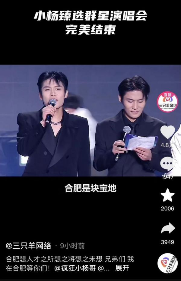比如在演唱会的谢幕环节,疯狂小杨哥表示:“欢迎大家来合肥做客,这里是养人的地方是创新的天地,这里是日益成为各方人才的圆梦之地,这里是合肥,欢迎兄弟们。”