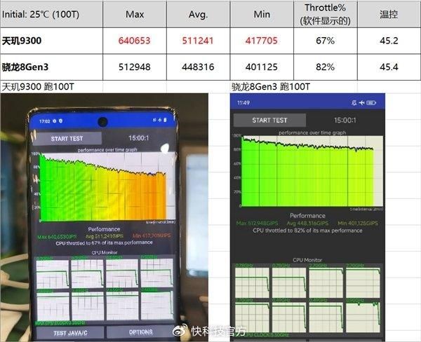 在设置同等45°C温度墙条件下,天玑9300的全大核架构性能明显更强,尤其20T极限性能大幅领先,甚至温度也更低一些,能效比明显更胜一筹。