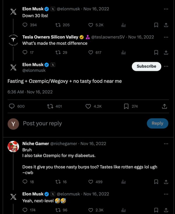 所有人都在关注马斯克打针减肥的成功,但在他分享自己打减肥针的内容下,回复着网友“自己打嗝技术显著提升,满是臭鸡蛋味。”