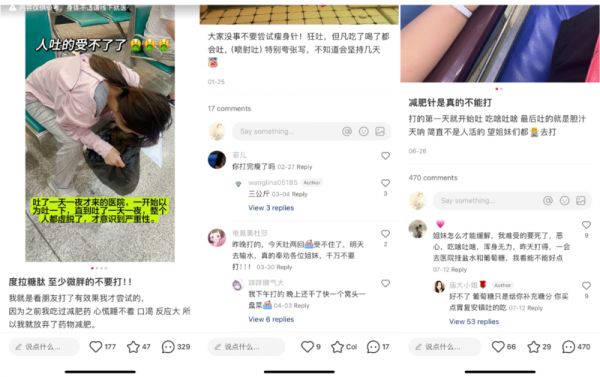 小红书上,关于减肥针瘦身“三盒瘦了20斤”“三周10斤”的贴子数不胜数,其中不乏90、100斤的女生为了再瘦5斤铤而走险,吐出胆汁,吐尽医院。无论如何劝退,评论区仍会出现“瘦了多少,想试试”的发言,拿健康做赌注。