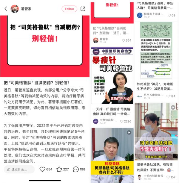 当下,在搜索“司美格鲁肽”关键词时,页面已经出现科学用药提醒,并且搜索结果前排皆为减肥针劝退内容。
