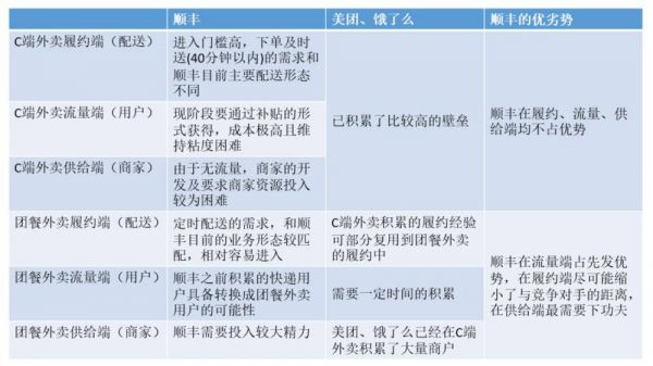 顺丰与美团、饿了么在C端外卖及团餐外卖的优劣势对比