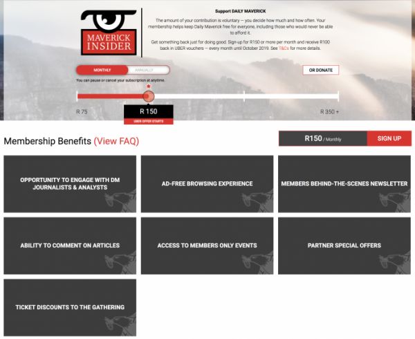 在转型过程中,Daily Maverick放弃了订阅付费模式,因为南非的经济形势不容乐观,相当一部分读者无力支付订阅费用,如果只依靠富裕的读者付费,网站将面临更为严峻的形势。在Membership Puzzle Project(纽约大学的一个公共研究项目,致力于资助和引导想推出会员计划的新闻机构)的帮助下,网站开始尝试会员项目,其目标是让所有用户能够免费获取高质量的新闻和调查,同时继续发挥社会监督的职能。