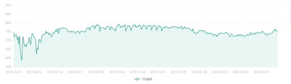 Keep的7日留存曲线看,虽然留存率较2019年有所微降,增长太快也会影响留存率。比起曲线左侧2019年5月同期,过山车一样的不稳定尖峰峡谷数据,还是好多了。