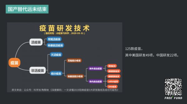 截至 4 月底,全球在研新冠疫苗 125 款,其中中国开发 22 款,少于美国的 49 款。我们在灭活疫苗方面的进展是比较迅速的。康希诺生物与军事医学研究院生物工程研究所联合开发的腺病毒载体疫苗(Ad5-nCoV),也推进到 II期临床阶段。