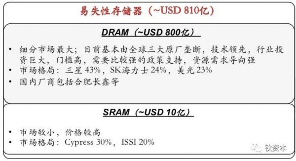 回到半导体存储产业的情况,在诸多的存储方式中,最大的市场是DROM和NAND Flash。其中DRAM会更大一些,国际上有三星、海力士等非常强大的企业,大约有800亿美金的市场份额。