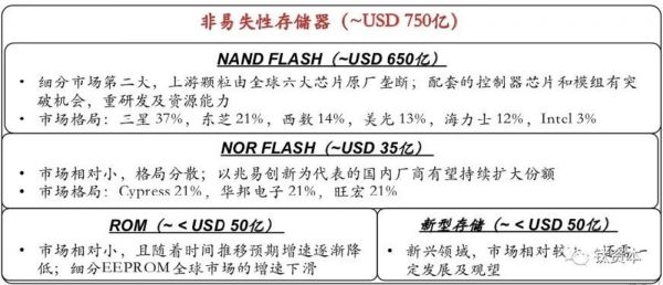NAND Flash大约有650亿美金左右,有三星、东芝、美光、海力士等代表企业,现在国内合肥长鑫、武汉的长江存储在这些方面有长足进步。国内这两年奋起直追,差距会变得越来越小。NOR FLASH也是一个非常重要的分支。除此之外,SRMA也是一个重要品类,但是任何一种半导体存储技术的成熟,都需要比较长的时间来逐步完善,目前而言规模还比较小。