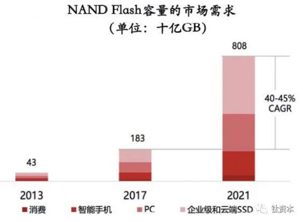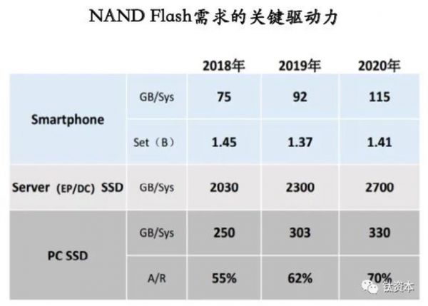 2019年NAND Flash已经到达了3090亿GB的市场容量,以后还会持续增长,根据趋势预测到2021年会超过8000亿GB,主要是因为智能手机的存储容量需求越来越大以及PC的硬盘SSD化是不可逆转的趋势,在数据中心更是如此,因为数据中心对数据读写的速度有更高的需求。