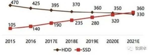 2015-2021全球HDD、SSD出货量(单位:百万台)
