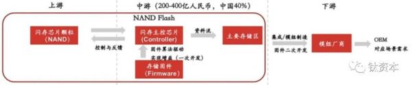 中游主要是闪存的主控芯片以及存储的固件。存储固件是运行在闪存的主控芯片中,至于为什么把它要单列出来,是因为有些固件和controller,与主控芯片由不同的厂商来提供,controller的市场大约有200亿人民币左右。