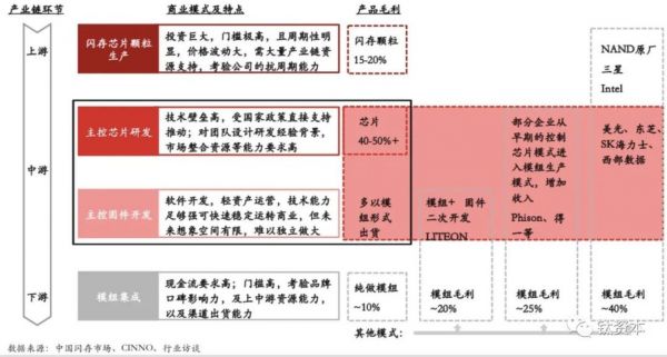 一些上游厂商没有自己的主控,就需要好的主控芯片与自己的闪存颗粒设计进行很好的结合,来发挥闪存颗粒的性能,让产品更受欢迎。另外下游模组厂商开发需要跟驻空以及存储固件方面做一些阈值性开发,以满足某些产品特定的指标,因此任何一个产品从模组厂出来之前,都要和上游的这几个元素进行深度绑定,从而产生粘性。所以从上下两个特征来看,中游不会被边缘化,也不会被上下游强势挤压,这是这个行业的特点。而这个特点对选择投资标的以及方向,都非常重要。
