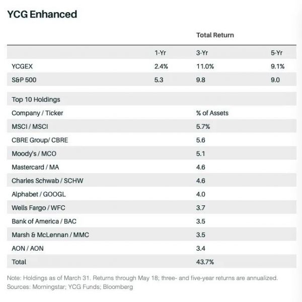 2012年底,这对联席经理人推出了YCG增强型基金,过去五年年均回报率为9.1% ,高于92%的同类大型混合型基金 (注意,该基金1.19% 的费用比率高于其类别平均水平)。自2008年成立以来,截至4月底,该公司的投资策略年回报率为10.8% ,而标准普尔500指数的年回报率为9.5% 。
