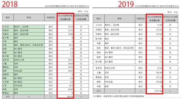 公司2019年年报显示,公司几个高管2019年的薪资相较2018年都有大幅提升,6人的薪资增加超过2450万。其中副总经理李晓萍薪资增长500万,副总经理李德来薪资增长200万,监事曹晓北薪资增加607万,董事会秘书侯俊薪资增加603万,监事王鑫薪资增加近250万,财务总监曾艳薪资增加307万。王长田2019年在光线传媒拿到的薪资则不足72.5万元,相较2018年增加了3200元。