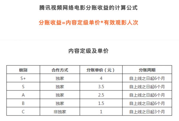 在这个制度下,网络电影在腾讯视频平台上会被分为S+、S、A、B、C五个等级,最高级S+的分账单价为4元,最低等级C为1元。其中独家合作影片的分账周期为6个月,非独家影片为C级,分账周期3个月。