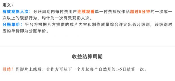 与此同时,腾讯视频也对结算周期进行了更新,将周期缩短至月结,即影片上线后,合作方可从下一个月起每个自然月的1-5日结算一次。