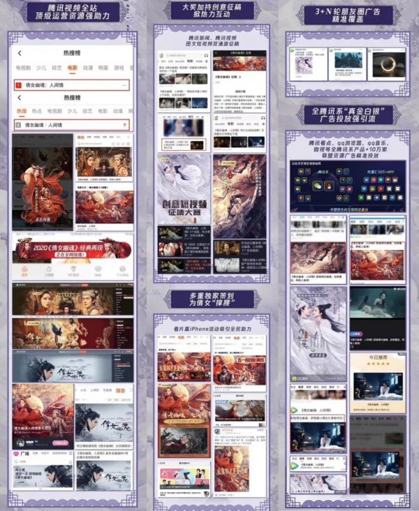 以《倩女幽魂:人间情》为例,腾讯视频不仅在站内提供了核心推荐位、独家专题策划等资源,而且还打通了腾讯新闻、QQ空间、QQ浏览器、QQ音乐、微信朋友圈、微视等全腾讯系产品进行广告投放。另外,平台还发动电视端的厂商、虎牙、知乎、快手以及包括像华为这样的渠道强势赋能。这些营销渠道都帮助《倩女幽魂:人间情》实现了引流。