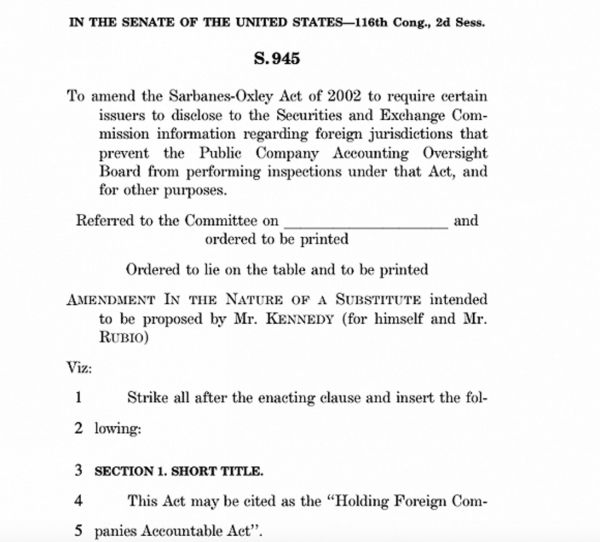 当地时间5月20日,美国参议院又通过《外国公司承担责任法案》。其中规定,任何一家外国公司连续三年未能遵守PCAOB的审计要求,将禁止该公司的证券在美国证券交易所上市交易,此外还要求上市公司披露它们是否为外国政府所有或控制。