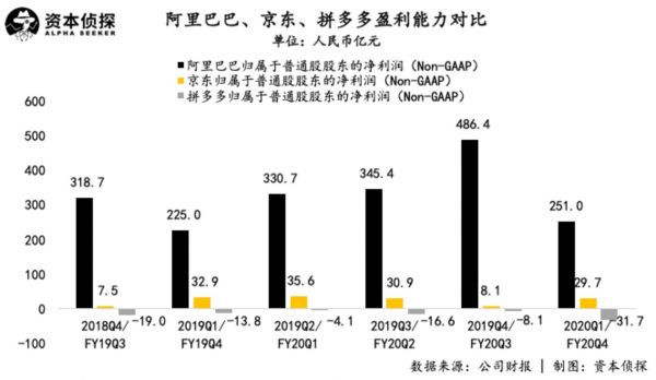 费用上的差异影响着三者的盈利水平,在非通用会计准则下,阿里巴巴、京东、拼多多归属于普通股股东的净利润分别为251亿元、29.7亿元和-31.7亿元。阿里巴巴的盈利能力依然遥遥领先,京东在疫情期间保持盈利,拼多多则亏损加大。