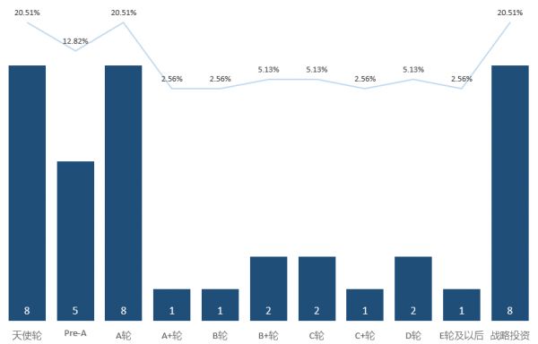 从融资轮次看,项目集中在战略投资和初创项目,战略投资、天使轮、A轮各发生8笔投资。