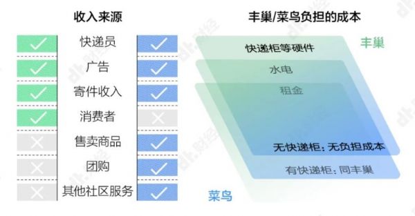 丰巢快递柜是自营模式,扩张成本主要由自己承担,但是品控较好;而菜鸟驿站现在采用的是加盟制,除了本身的技术投入外,驿站的建立以及后期维护成本是由加盟商承担的。因此,菜鸟付出的运维成本比较低,缺点是不太容易做好品控。