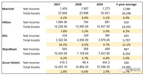 尽管在1993年率先采用了这种管理方法,但万豪的许多竞争对手都采用了这种方法。2019年,约80%的品牌酒店是特许经营。将万豪的资产回报率与同行相比,我们可以看到它的回报率与平均水平相当。在三年的平均基础上,万豪酒店的ROA为6.4%,希尔顿酒店为6.3%,洲际酒店为11.1%,温德姆酒店为5.6%,雅高酒店为1.7%。