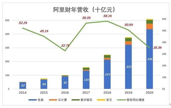 2020财年,阿里营收5097亿,同比增长35.3%,增加额达1328.7亿。其中: