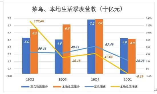疫情打乱了菜鸟和本地生活服务的增长节奏,但实际情况比人类想象的强很多。2020年Q1,本地生活服务取得48亿营收,同比下降8.1%;菜鸟营收还增长了28.2%。